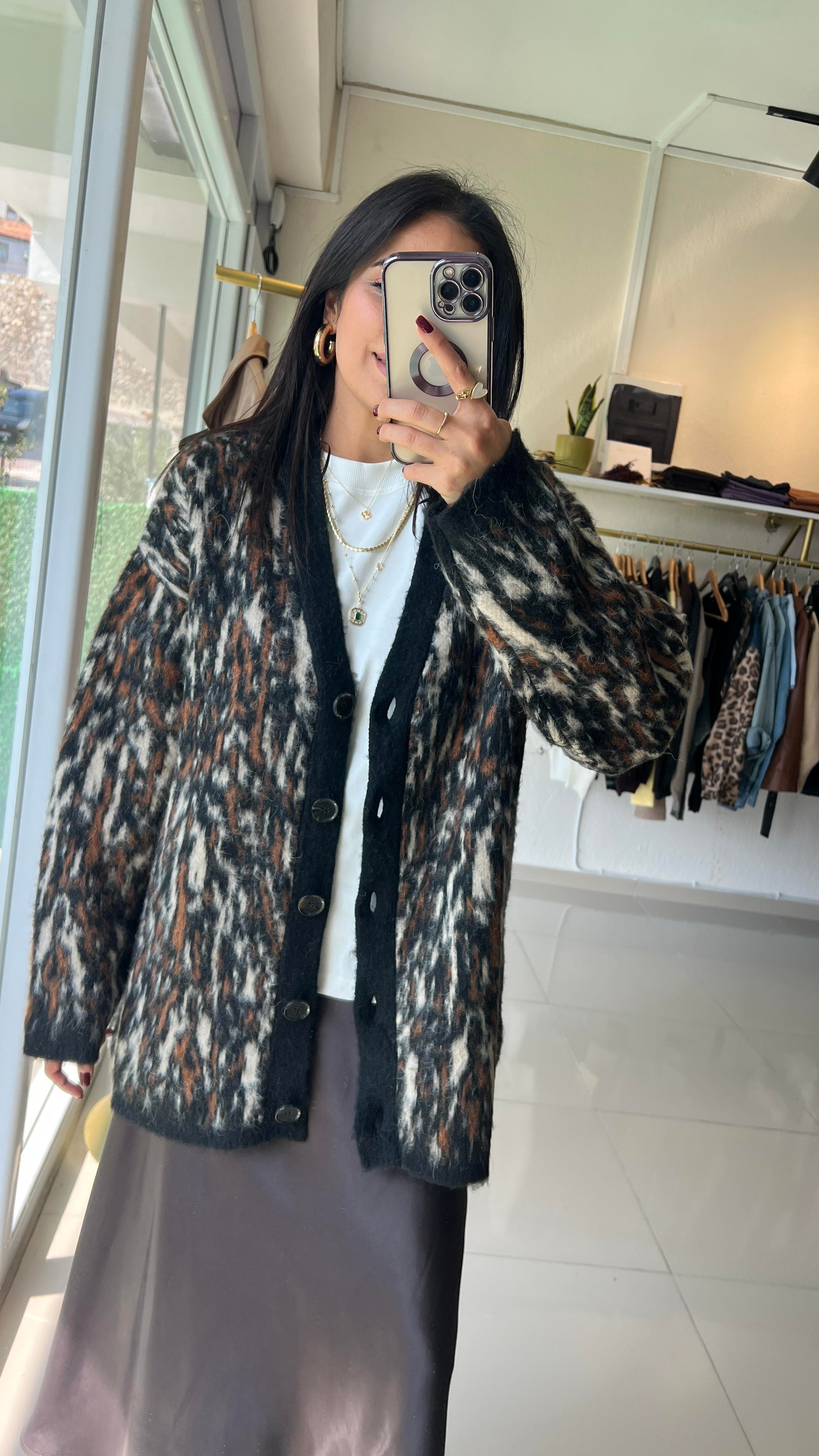 Desenli Şardonlu Düğmeli Triko Hırka-Siyah 60984
