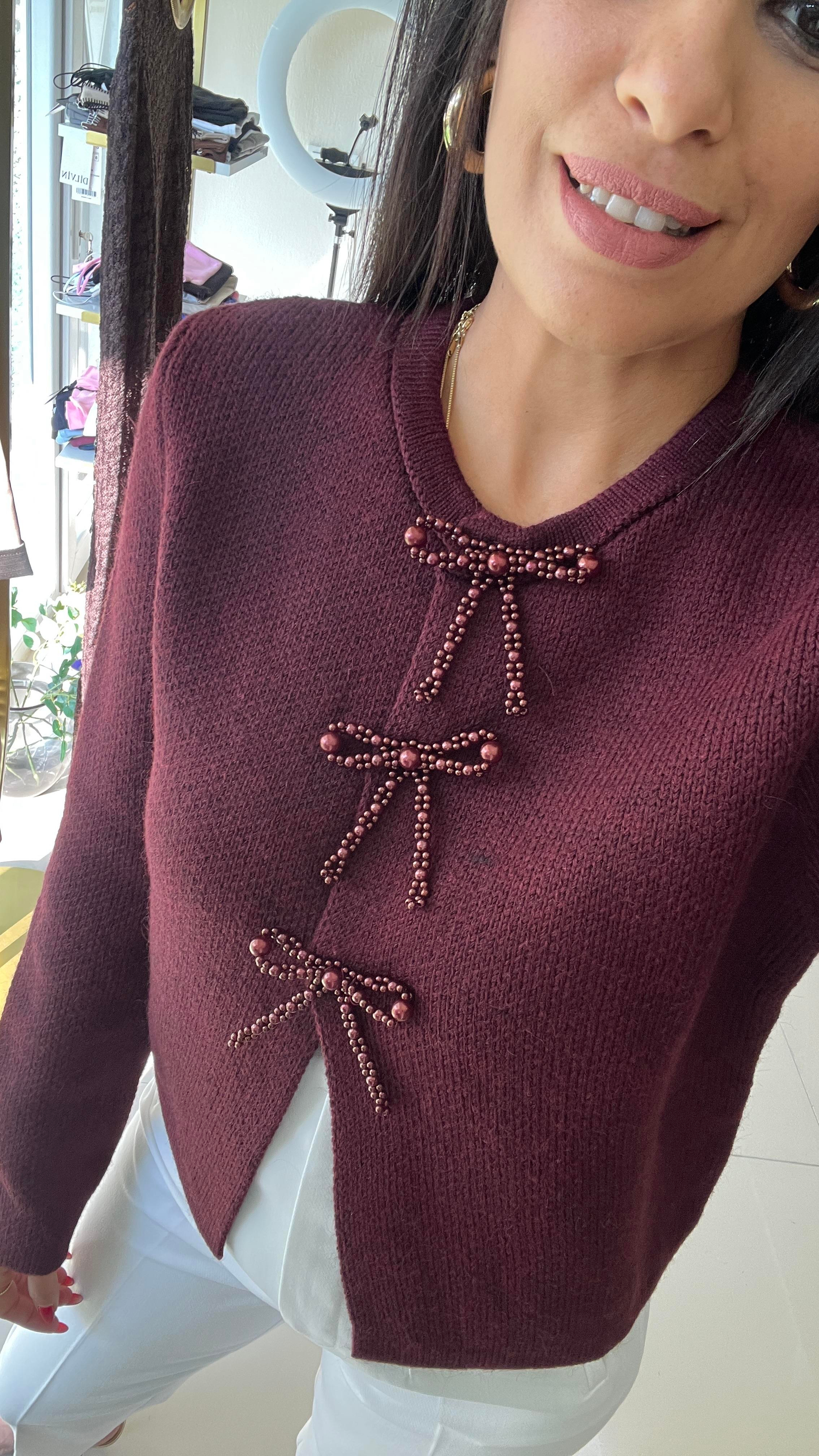 İncili Fiyonk Aksesuarlı Triko Hırka-Bordo 60983