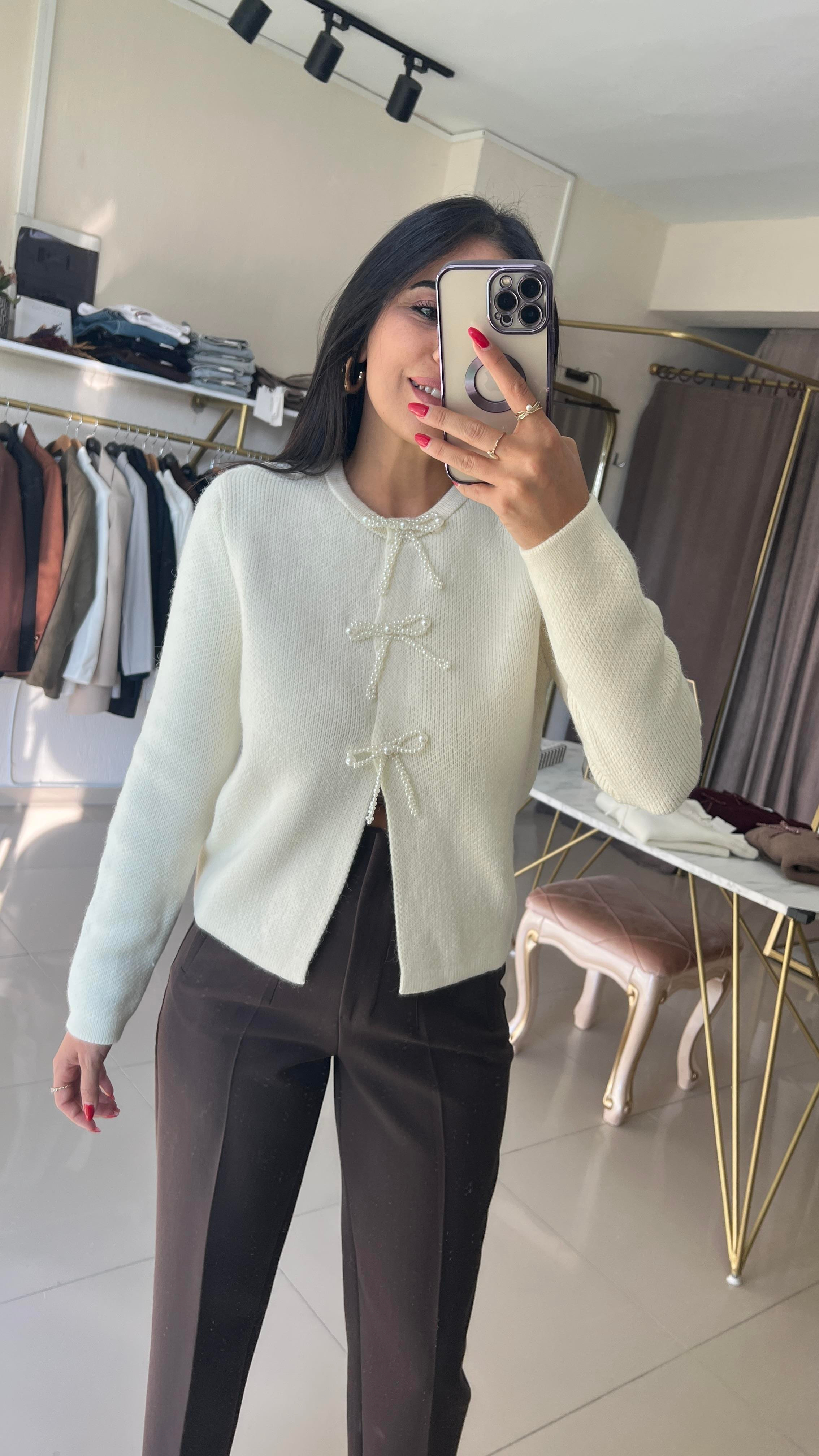İncili Fiyonk Aksesuarlı Triko Hırka-Ekru 60983