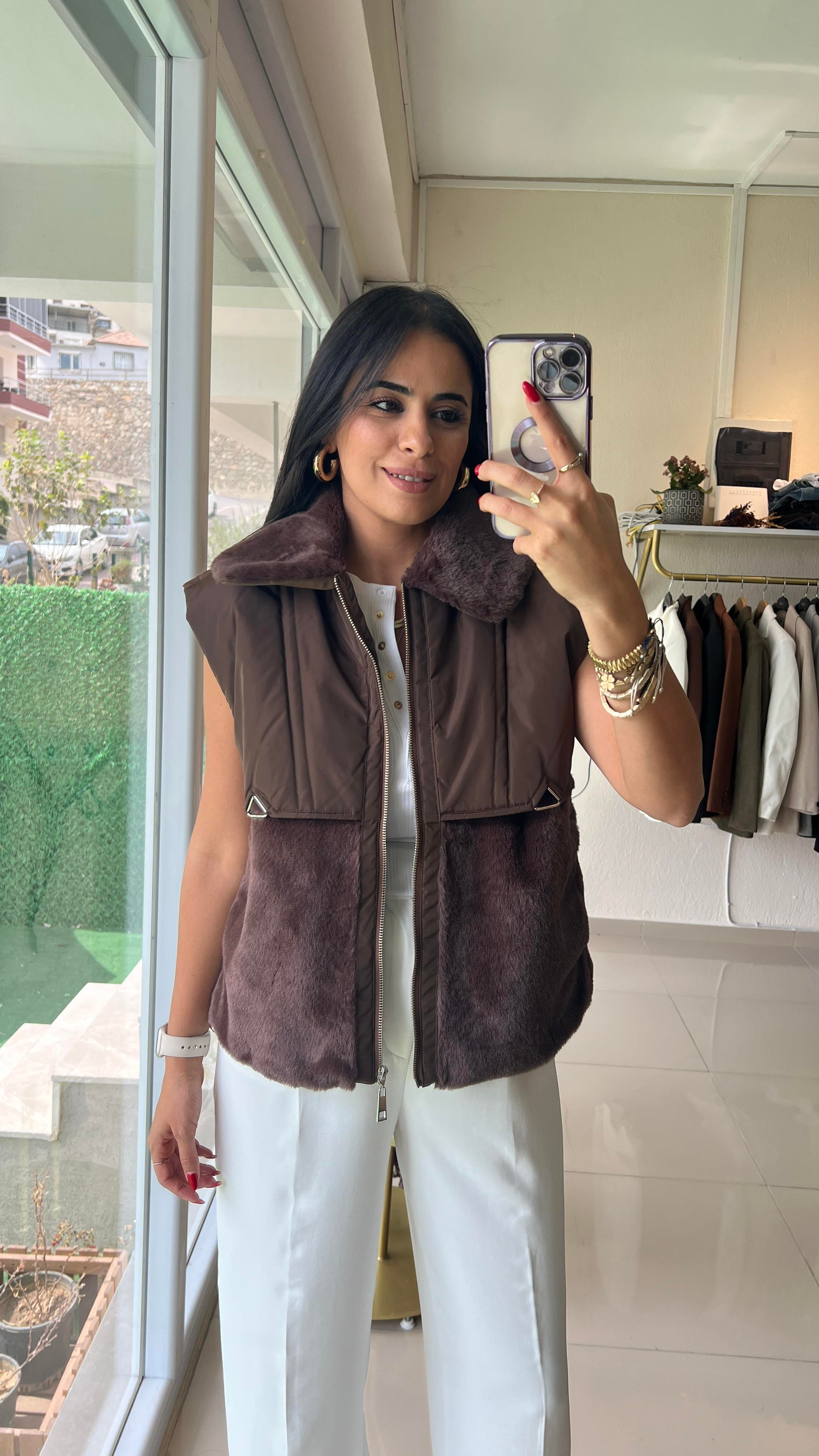 Yakası Kürklü Tasarım Yelek Kahve Y181